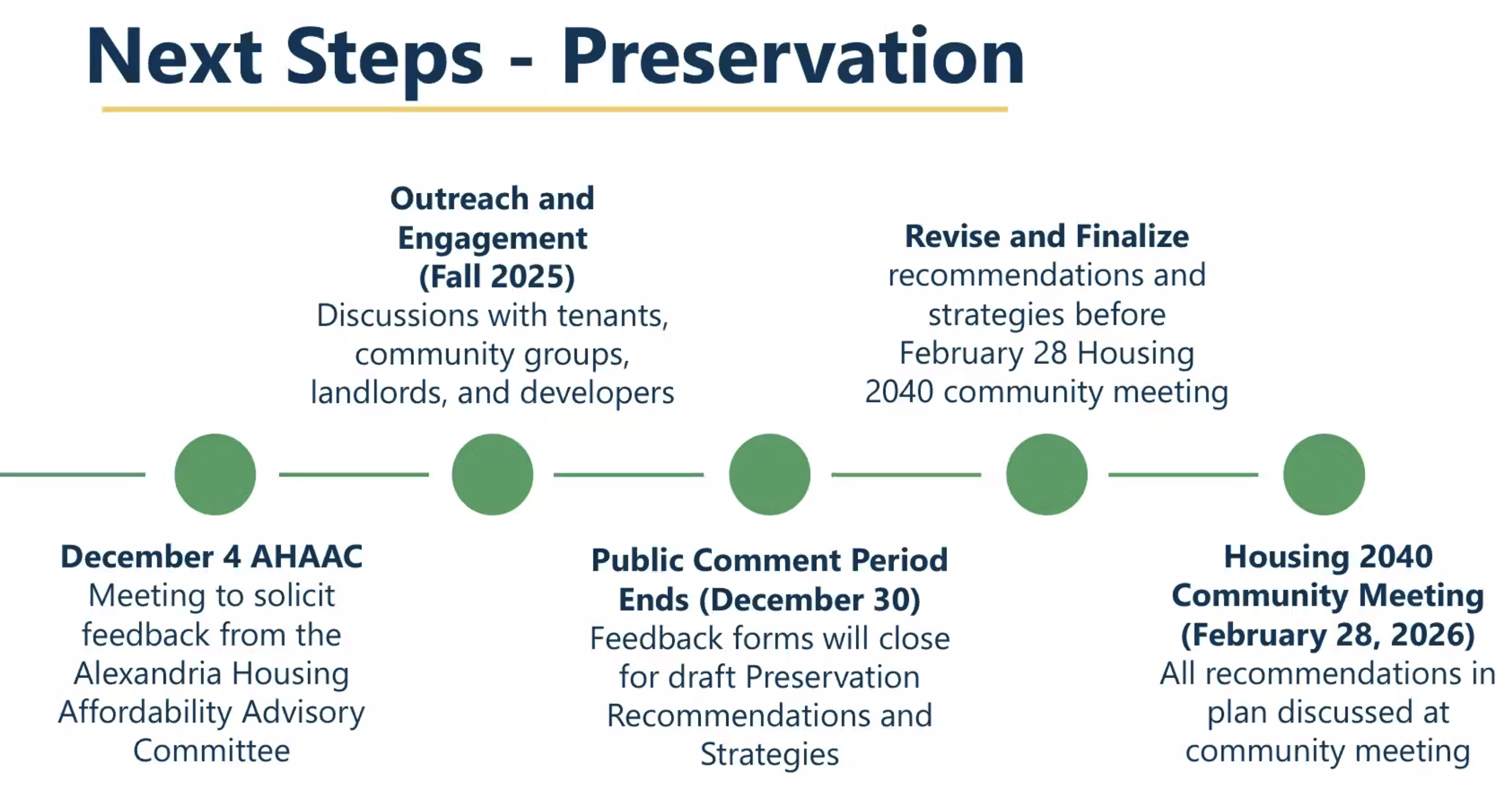 The public comment period on draft preservation and landlord-tenant recommendations remains open through December 30. The Alexandria Housing Affordability Advisory Committee reviews proposals on December 4 at 7 p.m. in City Hall.