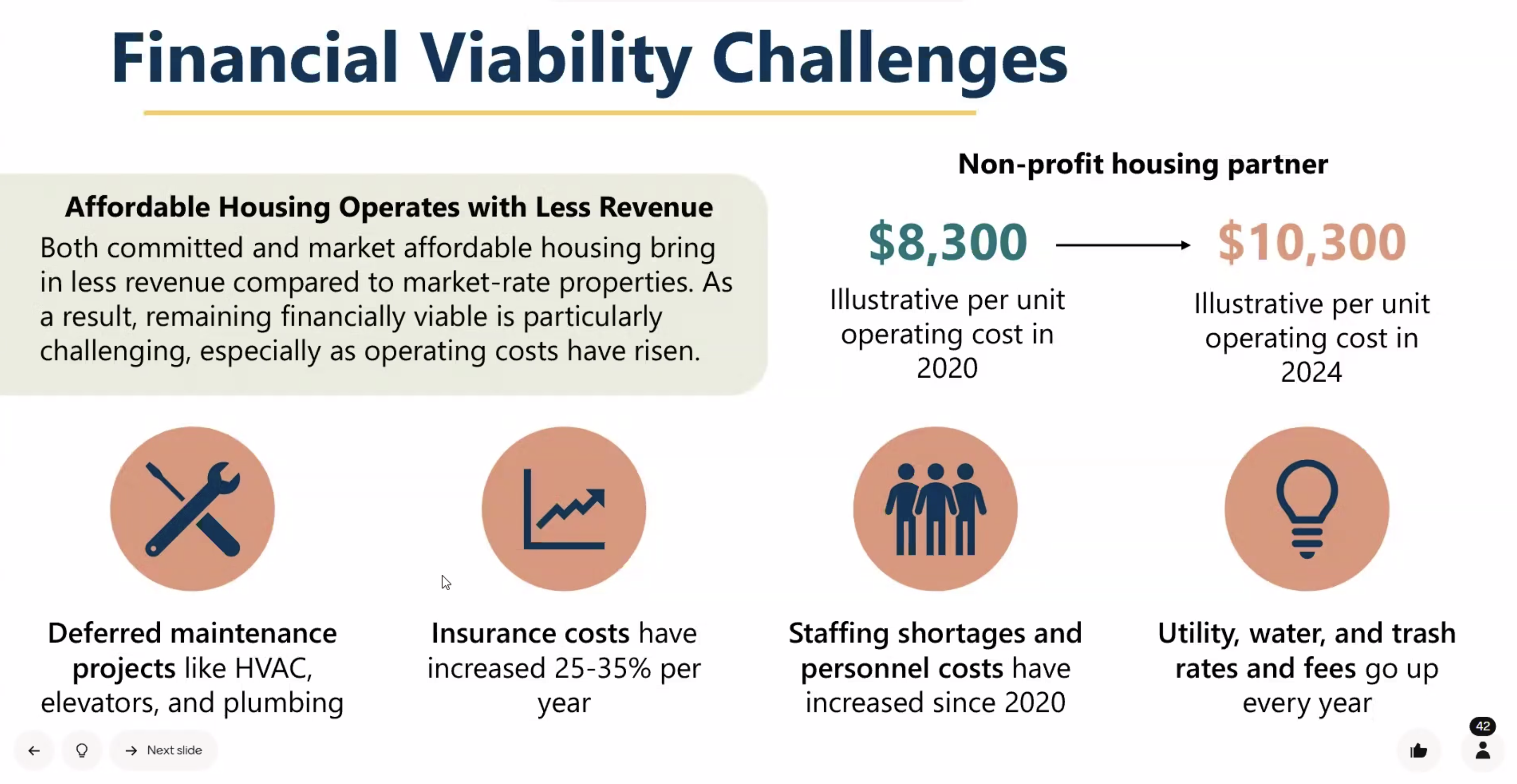 The rehabilitation creates a vicious cycle: Owners face enormous repair costs but can’t raise rents enough to cover them while keeping units affordable. Many choose to defer maintenance (leading to deteriorating conditions) or raise rents to market rate.