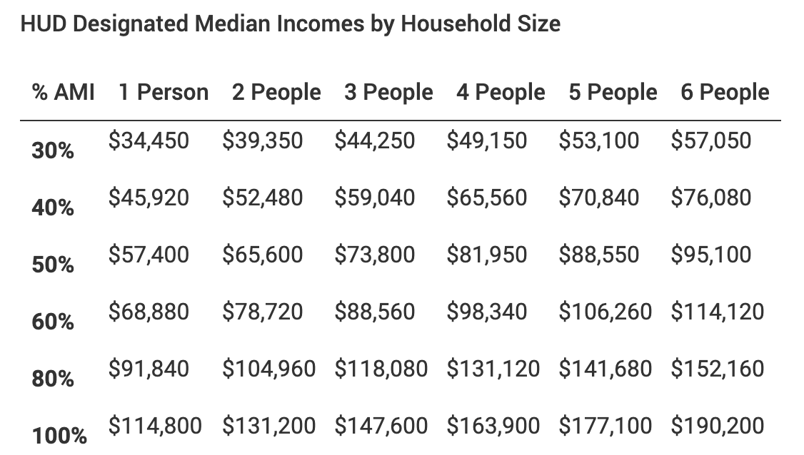 AMI (Area Median Income): Income benchmark where half of regional households earn more, half earn less.
