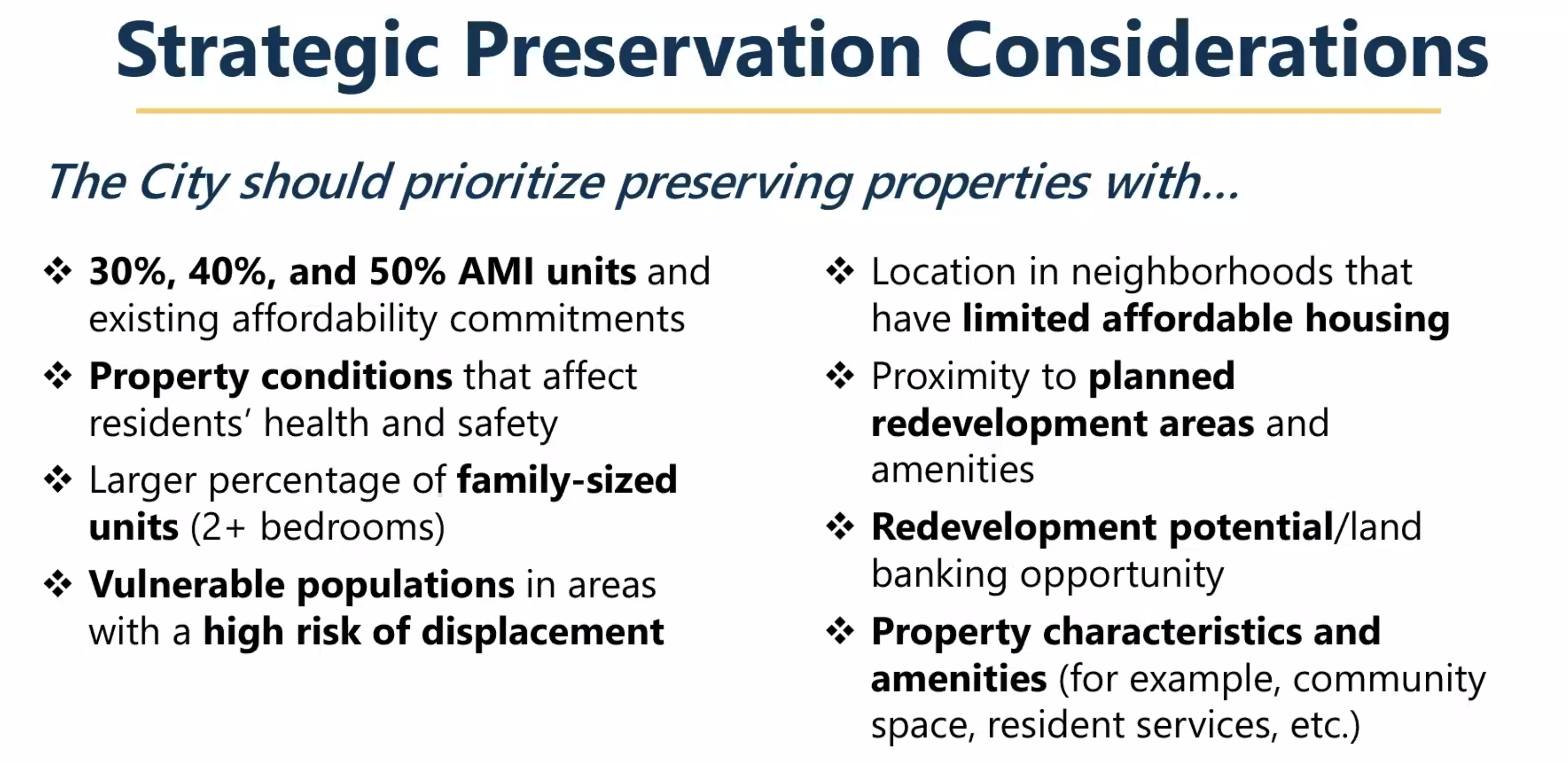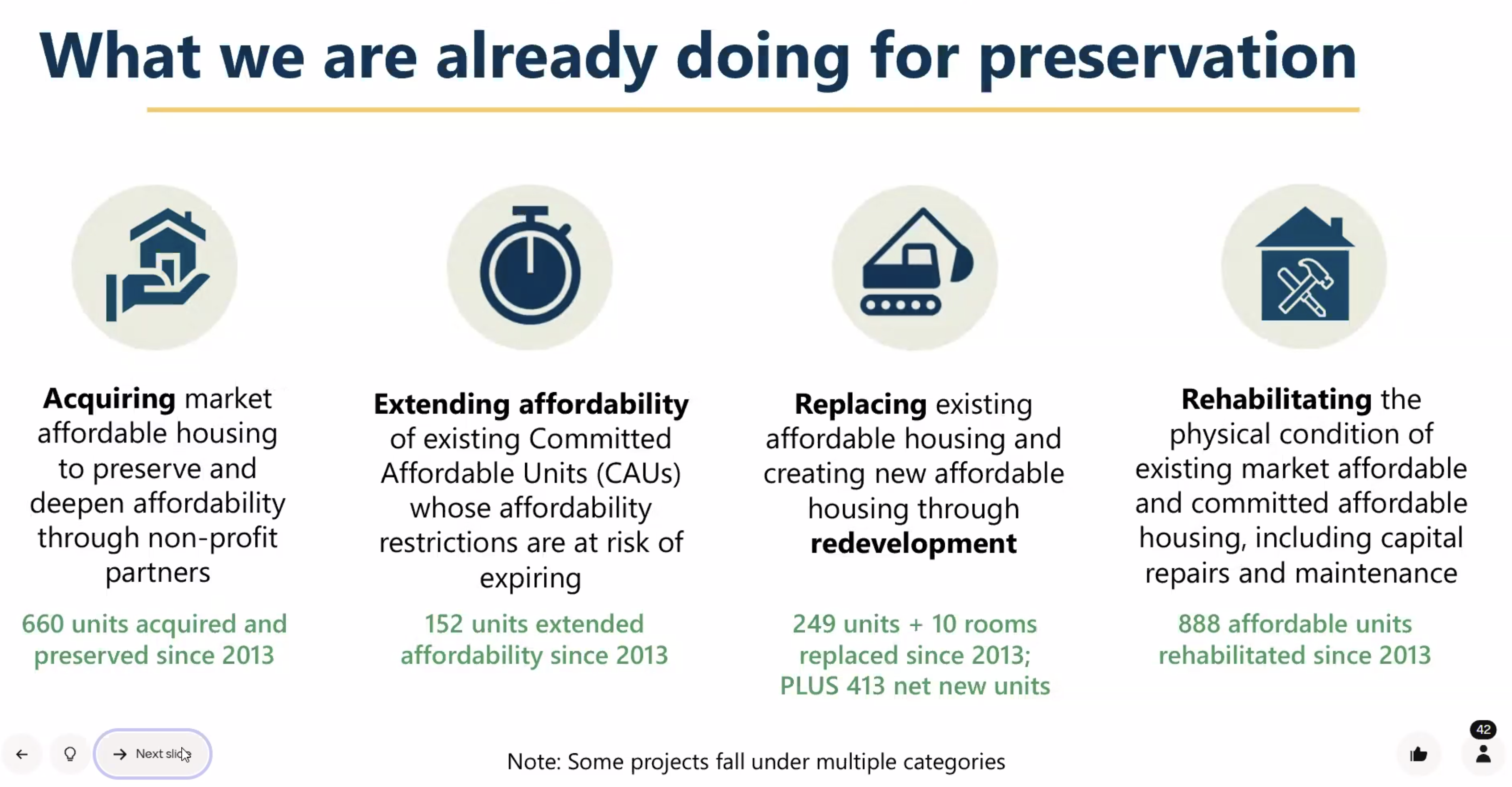 The pace matters: Preserving roughly 1,562 units over 12 years = approximately 130 units per year. But Monday’s presentation showed the city is losing an estimated 400+ market-affordable units annually. The city is preserving housing, but not fast enough to match the rate of loss.